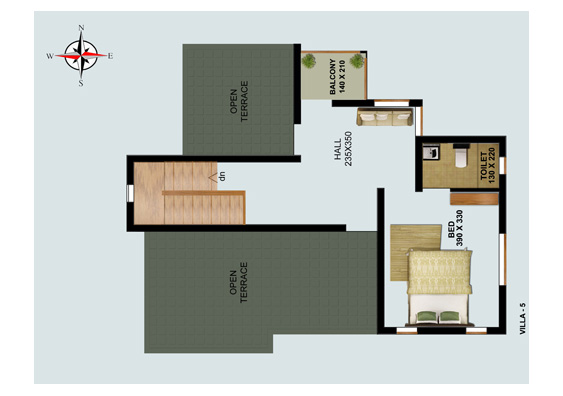 Anti-skid tiles on the floor and glazed tiles on the wall up to 7ft. height. Superior quality vitrified tiles of size 60x60cms. With epoxy filling.